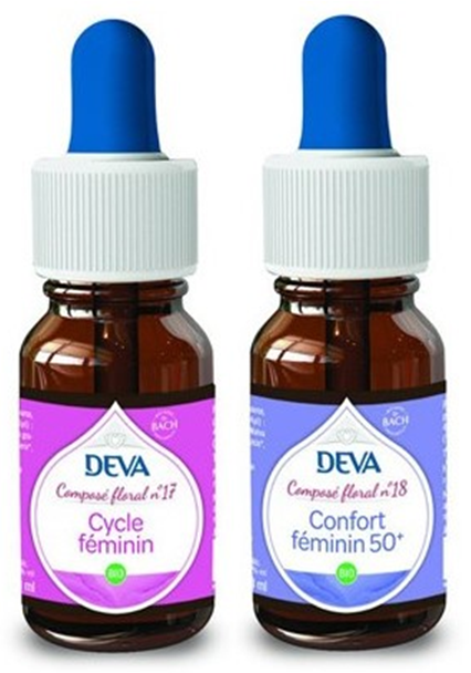 Deva a crée deux nouveaux composés floraux spécialement pour les femmes. Le composé floral 17 Cycle féminin atténue les désagréments émotionnels liés au syndrome prémenstruel. Il préserve l'équilibre et l'harmonie émotionnels de la femme tout au long de son cycle. Le composé floral 18 Confort féminin 50+ atténue les inconforts liés à la ménopause et la périménopause. Il invite à explorer de nouveaux potentiels créatifs et à réinventer sa vie avec douceur et détermination. Ces deux composés sont disponibles en 10ml flacon pipette ou vaporisateur.